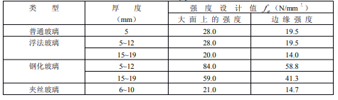 ②表中鋼化玻璃強度設計值取為浮法玻璃強度設計值的3倍。當鋼化玻璃強度不到浮法玻璃強度3倍時,應根據實測結果予以調整。